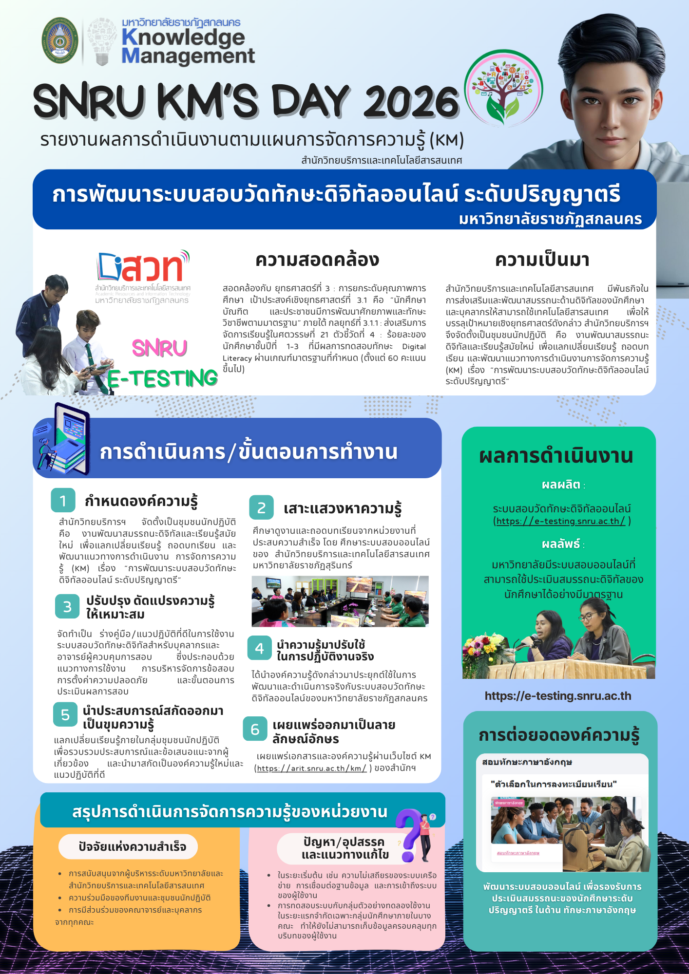 เมื่อได้สกัดและแลกเปลี่ยนองค์ความรู้จากกระบวนการดำเนินงานครบถ้วนแล้ว สำนักวิทยบริการและเทคโนโลยีสารสนเทศได้ดำเนินการรวบรวม จัดเก็บ และเผยแพร่ความรู้ที่เกิดขึ้นจากการพัฒนา “ระบบสอบวัดทักษะดิจิทัลออนไลน์ ระดับปริญญาตรี มหาวิทยาลัยราชภัฏสกลนคร” เพื่อให้บุคลากรและผู้สนใจสามารถนำไปใช้ประโยชน์และขยายผลได้อย่างต่อเนื่อง